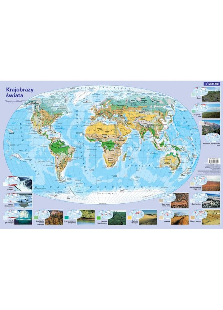 Głównym elementem podkładki jest mapa fizyczna Polski w skali 1 : 1 750 000. Na jej podstawie można poznać główne krainy geograficzne, rzeki, jeziora, szczyty oraz prześledzić przebieg granic lądowych i morskich naszego kraju. Elementy uzupełniające stanowią mapa podziału administracyjnego oraz informacje o polskich rekordach takich jak: najwyższe szczyty w poszczególnych pasmach, najdłuższe rzeki, największe i najgłębsze jeziora itp. To znakomita pomoc w nauce geografii naszego kraju!