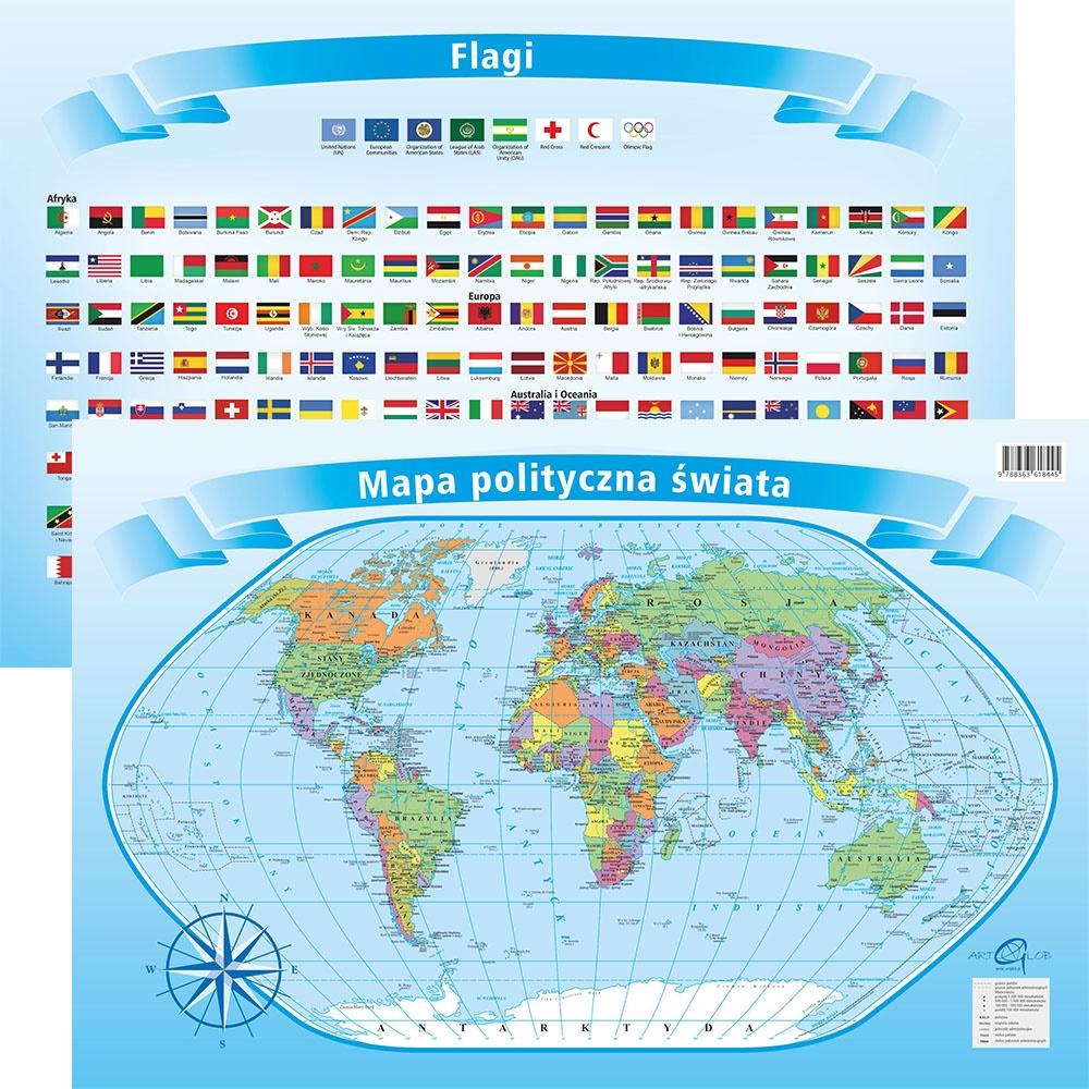 Rewers mapy to flagi wszystkich Państw Świata oraz najważniejszych instytucji międzynarodowych. Idealne narzędzie do poszerzania informacji z zakresu geografii. Podkładka jest laminowana grubym laminatem błyszczącym, można na niej używać mazaków suchościeralnych, bez obaw o jej uszkodzenie.