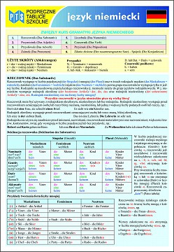 Podręczne Tablice Szkolne. Język niemiecki � zawierają podstawowe zasady gramatyki języka niemieckiego wraz z przykładowymi zdaniami. Przedstawiają reguły odmiany gramatycznej wyrazów, użycia rzeczownika, przymiotnika, zaimka, liczebnika, czasownika, przyimka, spójnika oraz budowy zdań złożonych. Tablice są pomocą z gramatyki na poziomie podstawowym i średnim dla gimnazjum, liceum, technikum oraz dla uczących się na kursach językowych. Tablice przydatne są również dla uczących się do Zertifikat Deutsch (ZD) i Zertifikat Zentrale Mittelstufeuprüfung (ZMP). Tablice mają formę 5-kartkowej składanki (trwałej, laminowanej) gwarantującej wygodne i łatwe poszukiwanie potrzebnych informacji.