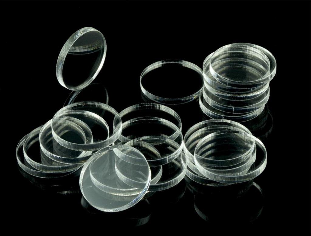 Akrylowe podstawki pod figurki w kształcie kwadratu, transparentne, o boku 50 mm i grubości 2 mm, 5 sztuk. Podstawki są zabezpieczone obustronnie folią.