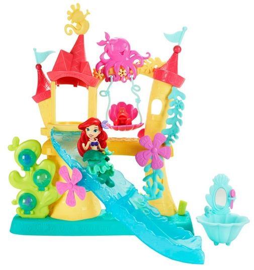 Podwodny zamek księżniczki Arielki z wieżą i zjeżdżalnią. W komplecie figurki Arielki i Sebastiana.