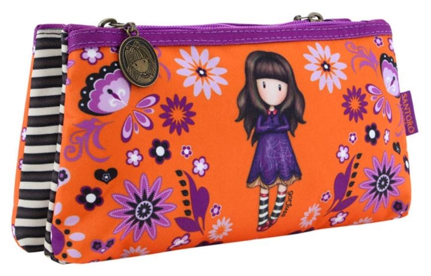 Podwójny piórnik - Gorjuss - Cobwebs. Podwójny piórnik ozdobiony grafiką w odcieniach królewskiej purpury i nasyconego pomarańczu. Zawiera dwie zapinane na suwak kieszenie. Suwak ozdobiony medalionem w stylu antycznego mosiądzu z główką dziewczynki Gorjuss. Zmieszczą się w nim zarówno ołówki i długopisy, a także przybory do szycia czy inne drobiazgi. Wykonany ze szczególną dbałością. Wewnątrz posiada ciekawy wzór w stylowe paski. Wspaniały prezent do szkoły lub pracy.