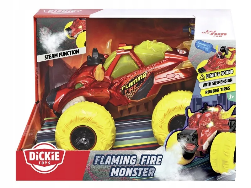 Pojazd Ognisty Potwór z wolnym kołem, funkcją światła i dźwięku, z pracującym zawieszeniem oraz gumowymi kołami. Dodatkowo posiada pojemnik na wodę, dzięki czemu wypuszcza parę wodną umieszczonym na masce otworem. Długość: 25 cm, 3l+