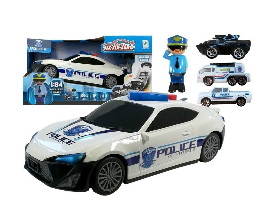 Dzieci od zabawkowych pojazdów policji wymagają zazwyczaj bardzo dużo. Czy posiada świecące koguty? Czy posiada działającą syrenę? Czy ma jakieś ciekawe funkcje? Na wszystkie te pytania można odpowiedzieć twierdząco, jeśli wybrano Policyjny Pojazd Transporter. Policyjny samochód utrzymany jest w kolorach białym i niebieskim z czarnymi szybami wyglądającymi jak przyciemniane. Reflektory pojazdu pokryte są farbą koloru kobaltowego, a koguty wykonane są z półprzezroczystego, niebieskiego plastiku. Na dachu pojazdu znajdują się 4 różnokolorowe przyciski - każdy z nich odpowiada za inny odgłos syreny policyjnej. Skąd jednak pochodzi nazwa Transporter? Otóż z przodu samochodu znajduje się przełącznik, za pomocą którego można podnieść całą karoserię autka odsłaniając przestrzeń, w której można umieścić dołączone do zestawu dodatki. Akcesoria, które można znaleźć w zestawie to 3 pojazdy służb specjalnych - opancerzony pojazd z działkiem, biały wóz strażacki i policyjny Pick-Up. W zestawie znajduje się także figurka funkcjonariusza policyjnego. Samochód osadzony jest na 4 kołach, które swobodnie się kręcą, przez co można bawić się bezproblemowo na większości gładkich powierzchni. Zabawka wykonana jest z twardego, lecz sprężystego plastiku, co redukuje ryzyko pęknięcia jego elementów. Wymiary pojazdu: 29 cm x 13 cm x 9,5 cm Wymiary dołączonych pojazdów: 7 cm x 3 cm x 3 cm Samochód Transporter Policji wyposażony jest w baterie, dzięki czemu jest gotowy do zabawy już po wyciągnięciu z pudełka. Ze względu na niewielkie elementy, zestaw nie jest przeznaczony dla dzieci poniżej 3 roku życia.