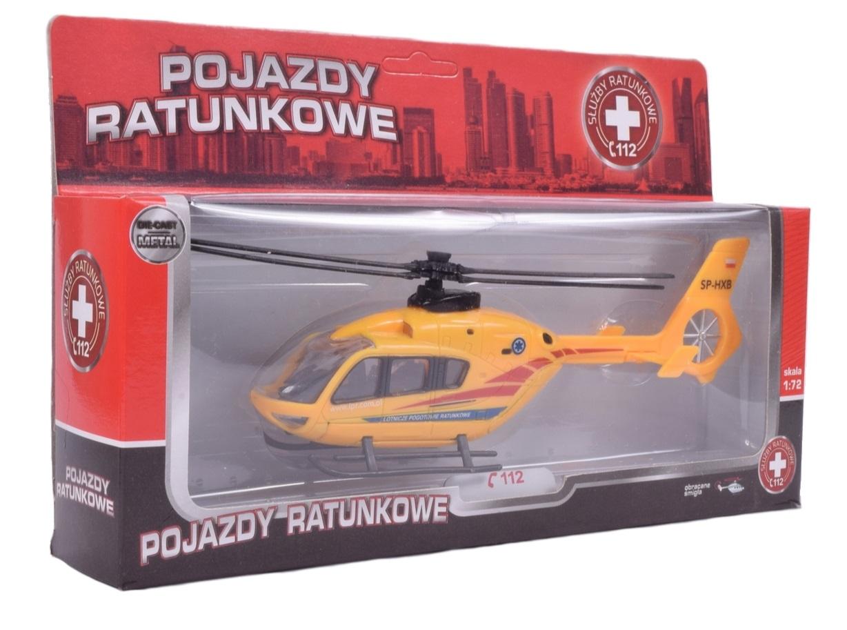 POJAZDY RATUNKOWE - HELIKOPTER RATUNKOWY Ilość asortymentowa: 4 Dostępne pojazdy: policja, straż, pogotowie, wojsko Opakowanie zawiera informacje o numerach alarmowych oraz schemat postępowania w kontakcie ze służbami ratunkowymi. Jednym z celów serii Pojazdów Ratunkowych jest kwestia przekazania dzieciom jak postępować w sytuacji zagrożenia życia. Kupując model zabawki dziecko otrzymuje zarówno charakterystyczny model pojazdu, a także spis najważniejszych numerów,które mogą posłużyć jako tzw. ""ściąga"".