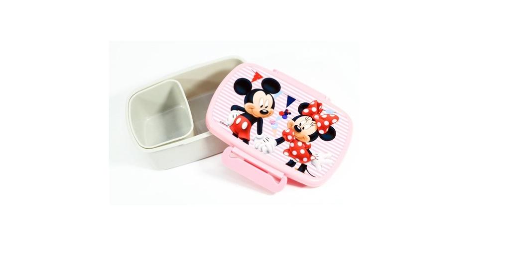 Pojemnik na śniadanie. Wykonany z plastiku - dolna część jednokolorowa, górna - wieczko z wielokolorowym nadrukiem. Zamknięcie plastikowe/zatrzaskowe podwójne na dłuższych bokach. Nie jest dostosowany do podgrzewania w mikrofalówce, ani do mycia w zmywarce. Wymiary:17,5x13x6,5cm