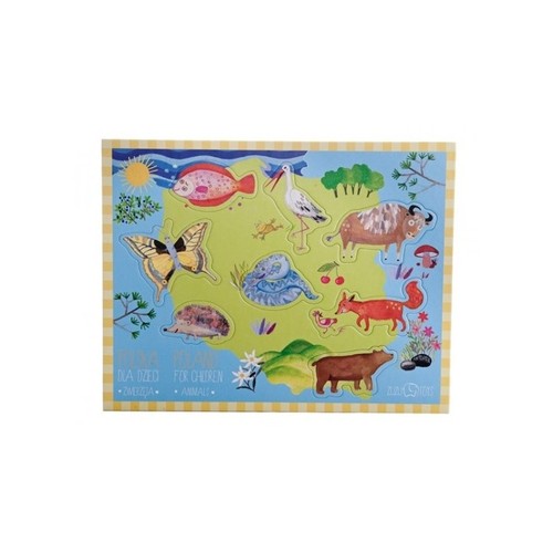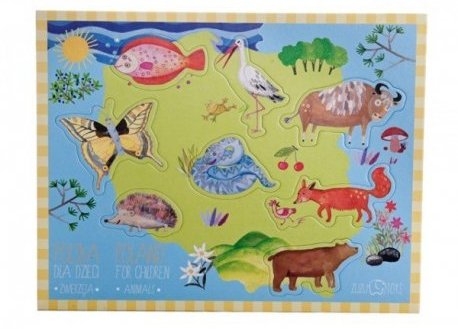 Polska dla dzieci: Zwierzęta to układanka dla najmłodszych. Na grubej tekturze obciągniętej płótnem umieściliśmy ilustrację Polski wraz z ośmioma charakterystycznymi dla naszego kraju zwierzętami.