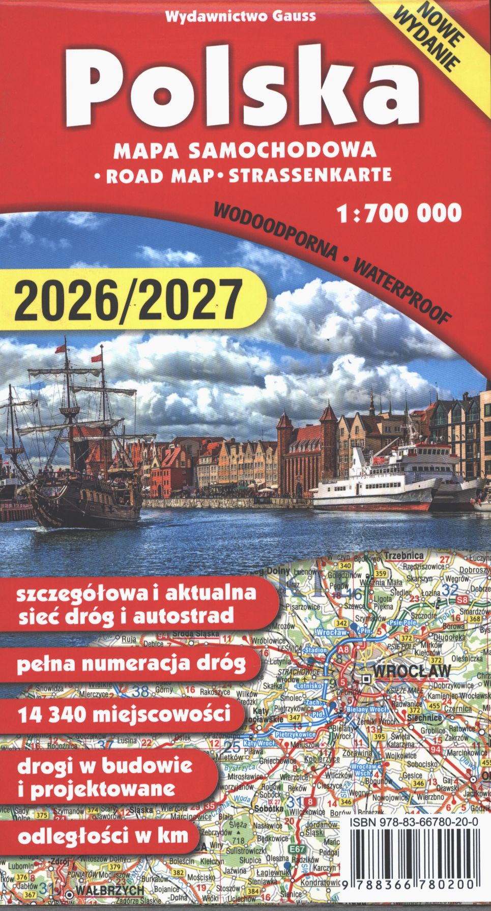 Dwustronna mapa samochodowa Polski w skali 1:700 000, w wersji wodoodpornej (foliowanej).