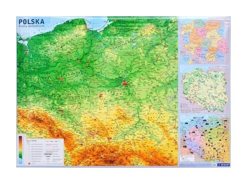 Polska - mapa ścienna w skali 1 : 1 700 000 - fizyczno-administracyjna. Oprócz szczegółowego barwnego obrazu ukształtowania powierzchni zawiera sieć rzeczną i jeziora, opisy krain geograficznych, wszystkie miasta i dużą liczbę wsi gminnych, oraz granice państw i województw