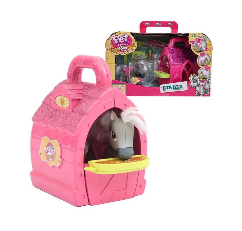 PONY PARADE, to linia zabawek, która łączy dziewczęcą miłość do Kucyków z innowacyjnymi funkcjami produktu, zapewniając wspaniałą zabawę! Naciśnij przycisk na grzbiecie Kucyka i zobacz, jak porusza głową, ogonem, uszami a nawet chodzi! Kiedy zaczepisz mu lejce, chętnie pogalopuje na wybieg. Każdy Kucyk zaopatrzony jest w dwa magnesy, dzięki którym możliwa jest interakcja z akcesoriami. Kucyka można zabierać wszędzie ze sobą, dzięki specjalnemu kuferkowi w kształcie boxu dla konika.