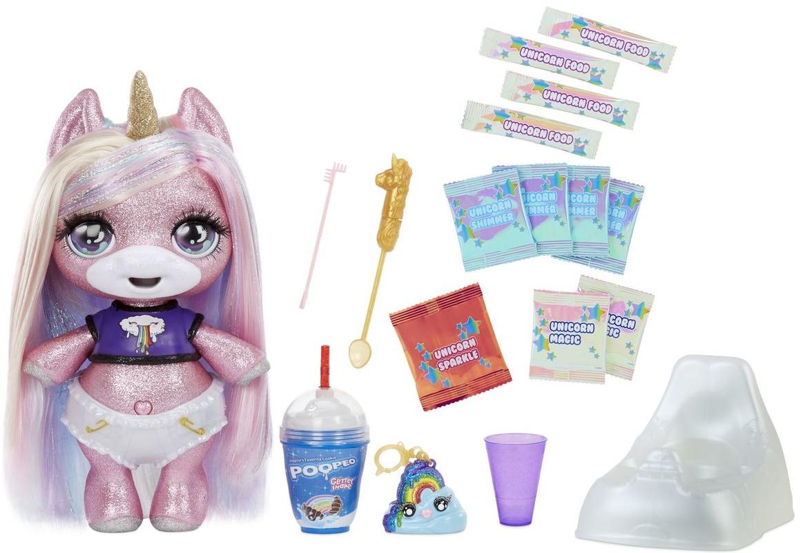 Magiczny klej do kupy z Poopsie Surprise Glitter Unicorn! Za każdym razem, gdy dajesz swojej Niespodziance Jednorożca butelkę i kładziesz ją na słoik z brokatem, robi zaskakującą, kolekcjonerską kupę jednorożca (śluz)! Z odrobiną magii i brokatu jednorożca możesz ozdobić kupę jednorożca i przekształcić kilka razy! Trzymaj kupę na magiczną zabawę, kiedy tylko chcesz! Ponad 20 magicznych niespodzianek za każdym jednorożcem-niespodzianką! W tej wersji możesz zdobyć 2 różne jednorożce. Który to jest, wiesz tylko, gdy rozpakowujesz zawartość. o Poopsie Surprise Unicorn zawiera jednorożca z niespodzianką o Słoik blasku. o Cztery pokarmy jednorożca (proszek śluzu), cztery magiczne opakowania jednorożca, musująca magia jednorożca o Ekskluzywna butelka i ekskluzywny brelok z figurą kupy o Jednorożecowa koszula i śliniaczek, łyżka, narzędzia do czyszczenia i miarka.