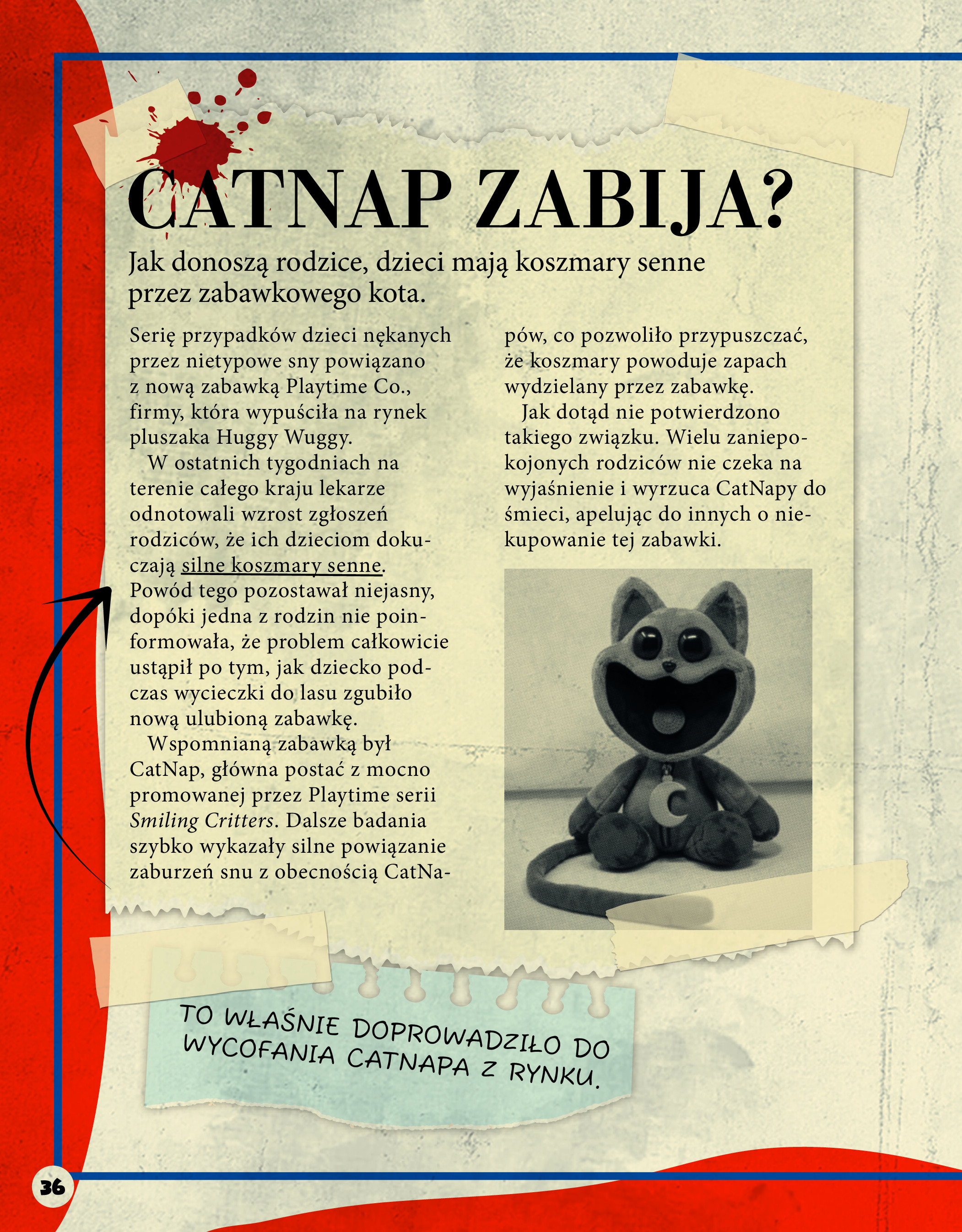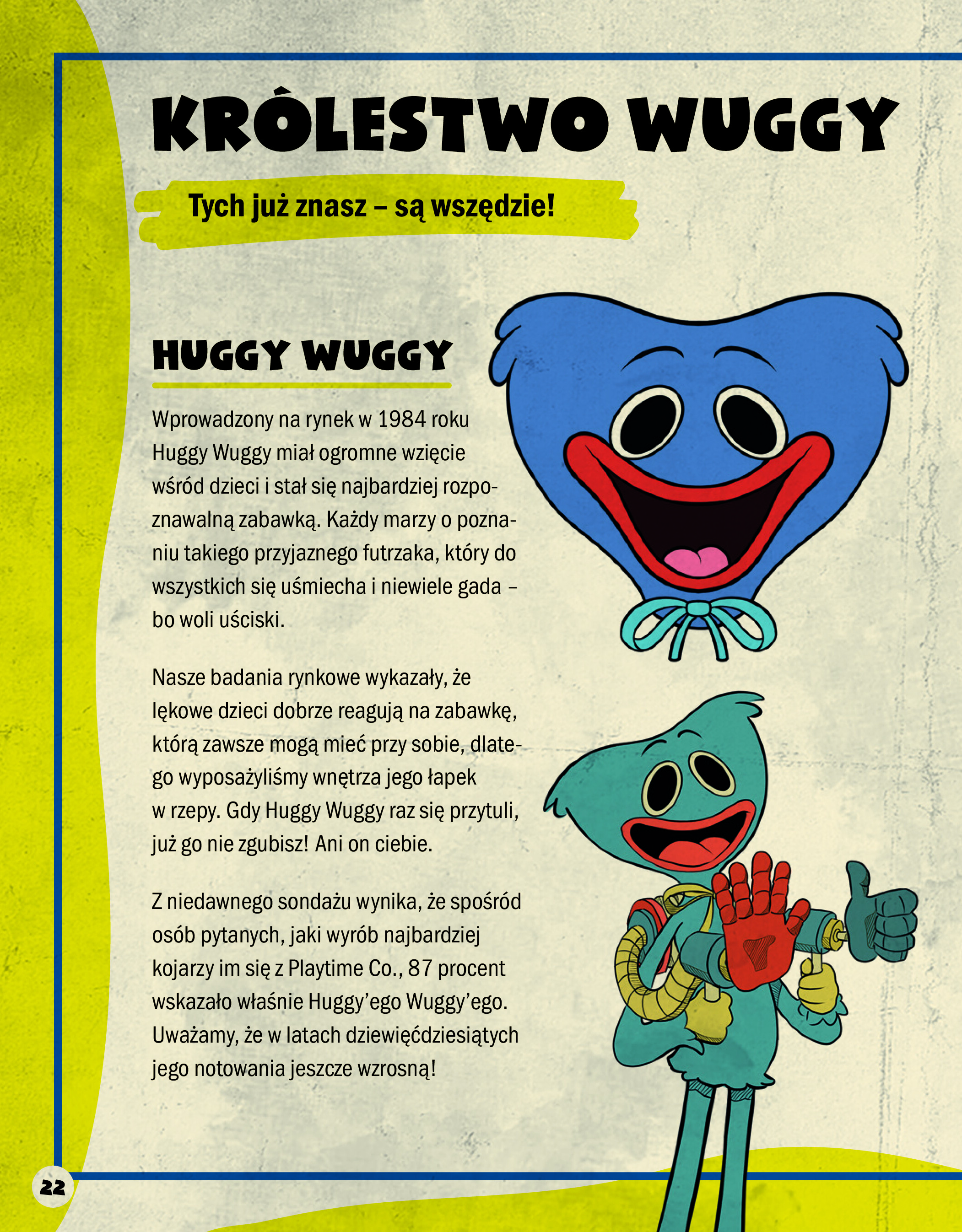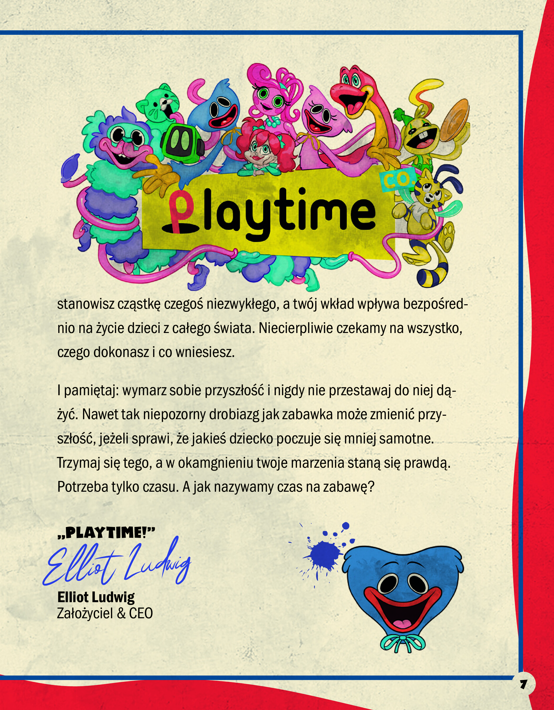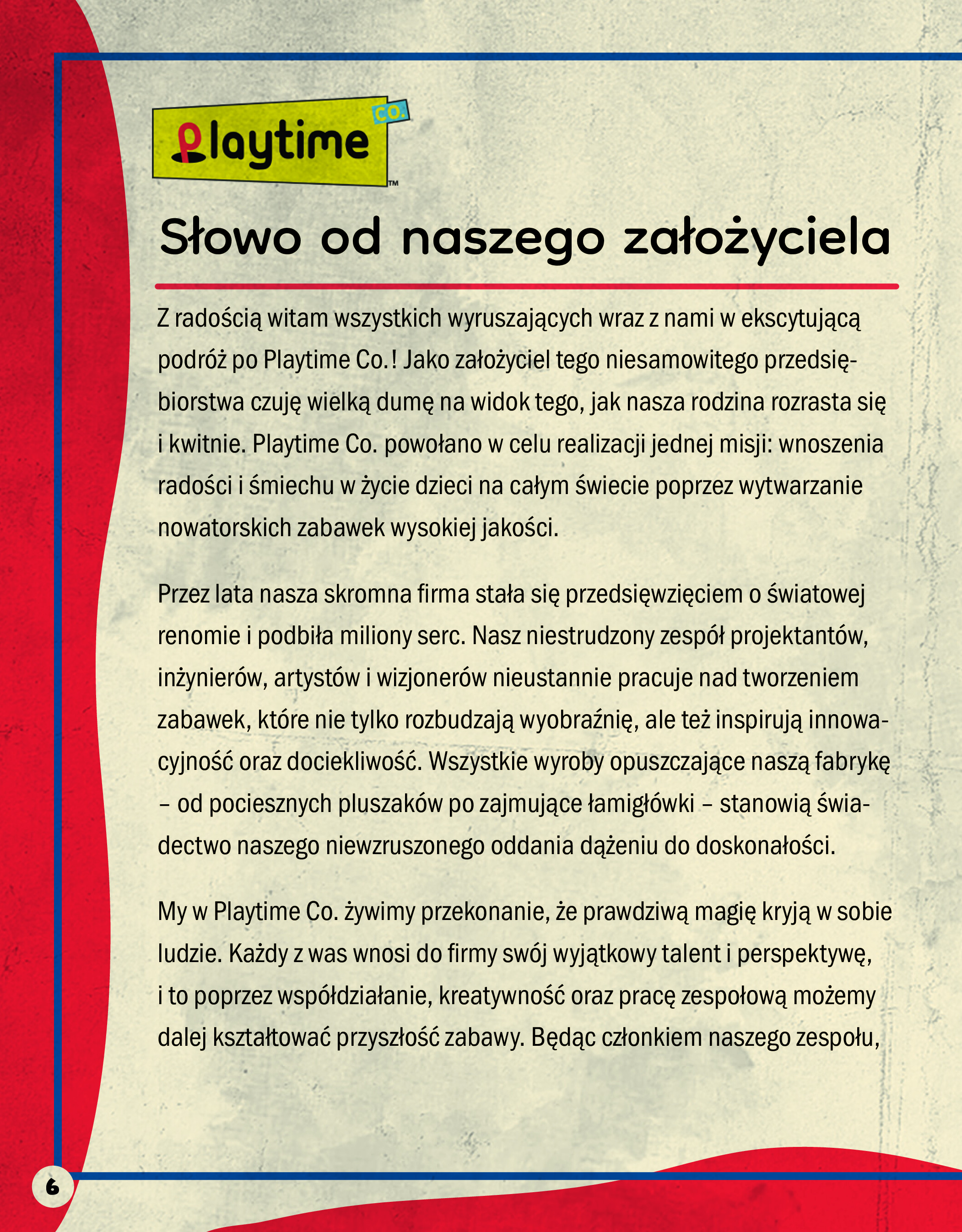 "Witamy w Playtime Corporation! Nie zwracaj uwagi na nasze zabawki, są zupełnie nieszkodliwe... w większości. Dzięki temu podręcznikowi dowiesz się wszystkiego, czego potrzebujesz, by zostać wzorowym pracownikiem naszej fabryki! Odkryjesz sekrety Huggyego Wuggyego, Mommy Long Legs i innych rozkosznych pluszaków, zapoznasz się z raportami o zupełnie niegroźnych incydentach i z notatkami, które pomogą ci pierwszego dnia pracy. Musisz tylko... spróbować przetrwać! Jeśli naprawdę chcesz poznać tę fabrykę, opowiem ci wszystko, co o niej wiem, a także o tym, co tu zobaczyłem i czego doświadczyłem. Dowiesz się wszystkiego, co powinieneś wiedzieć o ludziach stojących za Playtime Co. i o teoriach na jej temat, które mogą być prawdziwe. W rzeczywistości ta firma nie jest tym, czym się wydaje. P.W. "