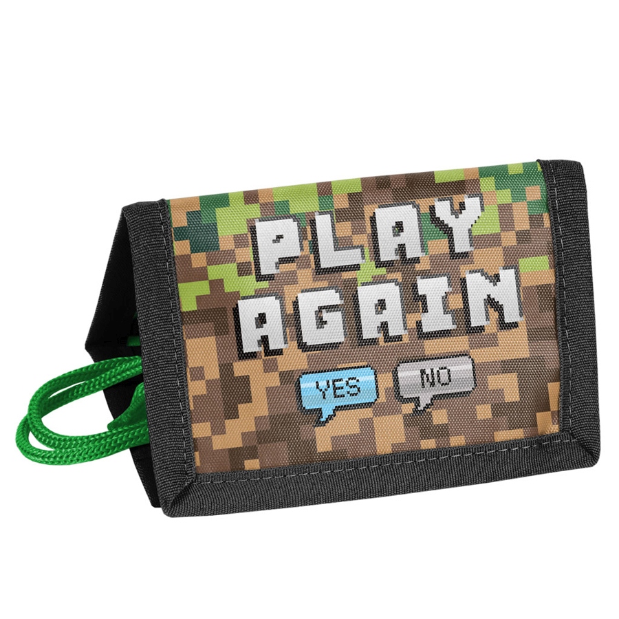 Portfel ze sznurkiem do zawieszania. Jedna przegródka na zamek na monety, jedna przeźroczysta kieszonka np. na zdjęcie, dwie dodatkowe kieszonki, jedna kieszeń przez całą długość rozłożonego na płasko portfela.