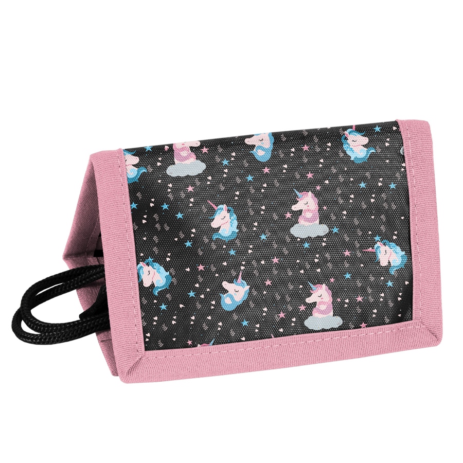 Portfel ze sznurkiem do zawieszania. Jedna przegródka na zamek na monety, jedna przeźroczysta kieszonka np. na zdjęcie, dwie dodatkowe kieszonki, jedna kieszeń przez całą długość rozłożonego na płasko portfela.
