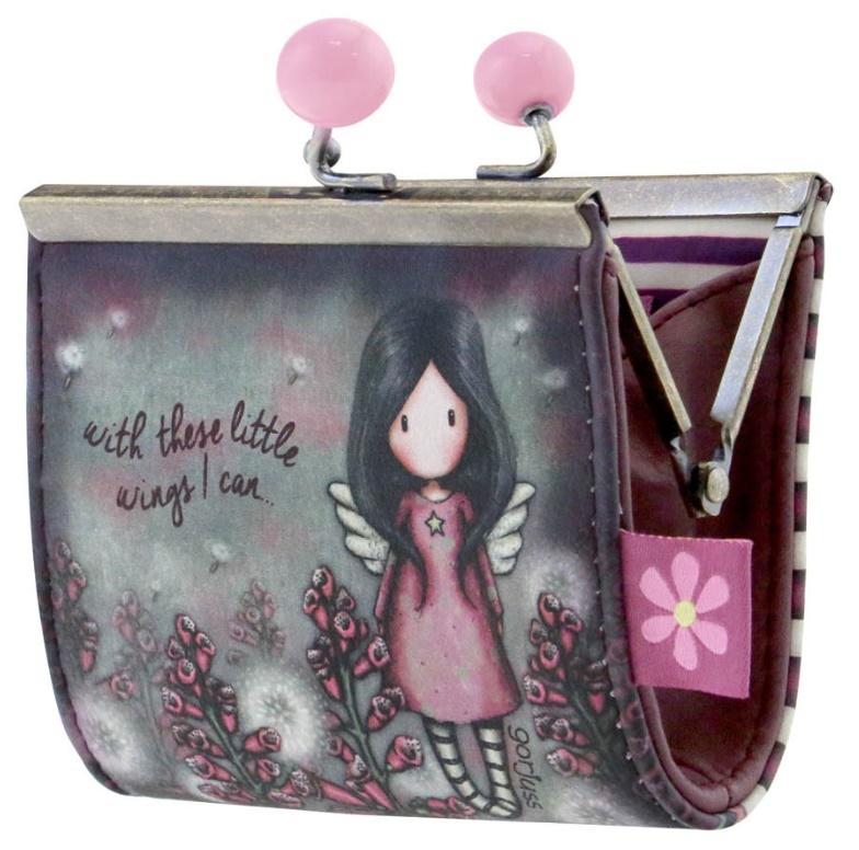 Piękna portmonetka, w której zmieścisz wszystkie monety. Ozdobiona wizerunkiem dziewczynki Gorjussze skrzydełami. Zatrzask w kolorze starego złota, wzbogacony pięknymi kuleczkami. Żywe kolory i wzorzysta podszewka oraz oryginalny wzór. Na odwrocie eleganckie logo Santoro.