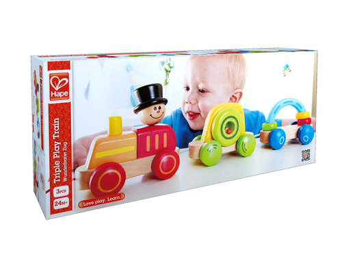 Ten drewniany pociąg do ciągnięcia na sznurku ma trzy wagoniki, które dają mnóstwo mozliwości do aktywnej zabawy dla małych iżynierów i pozwalają