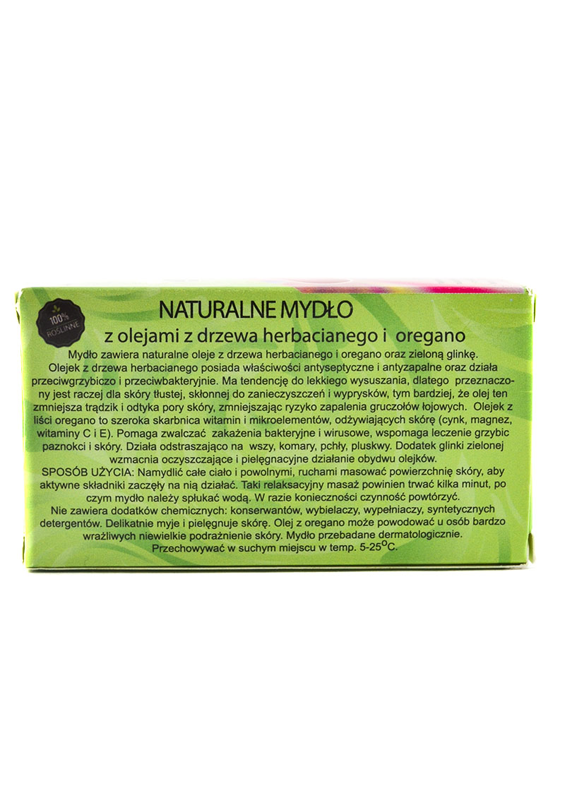Olejek z liści oregano to szeroka skarbnica witamin i mikroelementów, odżywiających skórę (cynk, magnez, witaminy C i E). Olejek z drzewa herbacianego posiada własności antyseptyczne i antyzapalne oraz działa przeciwgrzybiczo i przeciwbakteryjnie. Ma tendencję do lekkiego wysuszania, dlatego raczej przeznaczony jest dla skóry tłustej, skłonnej do zanieczyszczeń i trądziku, tym bardziej, że olej ten zmniejsza trądzik i odtyka pory skóry, zmniejszając ryzyko zapalenia gruczołów łojowych. Olejek oregano zwalcza zakażenia bakteryjne i wirusowe, wspomaga leczenie grzybic paznokci i skóry. Działa odstraszająco i eliminuje pasożyty skóry: wszy, komary, pchły, pluskwy. Dodatek glinki zielonej wzmacnia oczyszczające i pielęgnacyjne działanie obydwu olejków. Produkowane według tradycyjnej receptury z roślinnych, naturalnych surowców najwyższej jakości. Idealne do pielęgnacji skóry przetłuszczonej i trądzikowej.