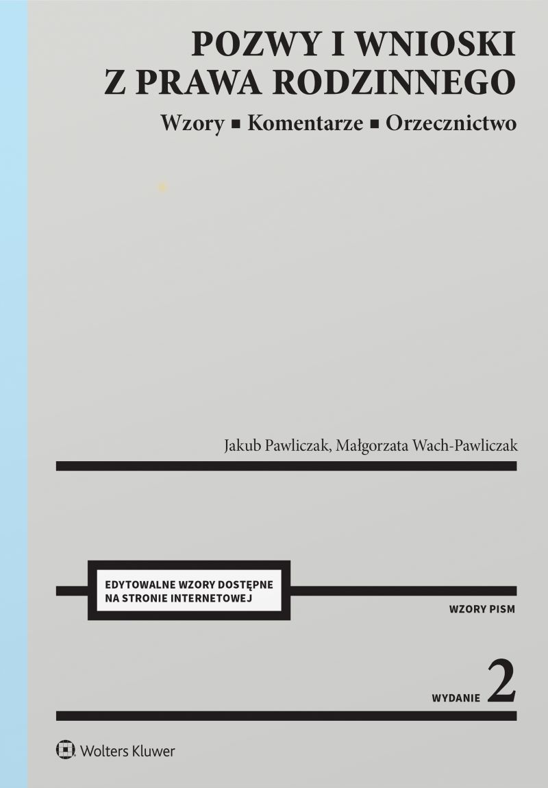 W publikacji w formie wzorów omówiono sprawy rodzinne rozpoznawane zarówno w postępowaniu procesowym, jak i nieprocesowym, najczęściej występujące w praktyce i na egzaminach zawodowych. Każdy wzór zawiera przykładowy stan faktyczny, wzór pisma procesowego dostosowany do tego stanu faktycznego, praktyczny komentarz oraz wybór najważniejszego orzecznictwa. Czytelnik po zapoznaniu się ze stanem faktycznym może spróbować sam przygotować odpowiednie pismo, a następnie skonfrontować je ze wzorem. Opracowanie pozwala nie tylko opanować praktyczne umiejętności formułowania pism procesowych, lecz także przyswoić i ugruntować wiedzę z zakresu prawa rodzinnego. Obecne wydanie zostało poszerzone o wzór pozwu o rozwód złożony na podstawie zawartego przez strony porozumienia rodzicielskiego w sprawie warunków rozwiązania małżeństwa oraz wzór wniosku o podział majątku wspólnego małżonków , w którym uwzględniono m.in. żądanie rozliczenia nakładów. Uwzględnia obowiązujący stan prawny, nowe orzecznictwo oraz zamiany w praktyce stosowania prawa. Publikacja jest przeznaczona dla radców prawnych i adwokatów, może również zainteresować osoby dopiero rozwijające swoje umiejętności prawnicze, w szczególności w ramach aplikacji, praktyk w kancelariach prawniczych czy też studiów prawniczych. Zawarte w książce wzory pism są dostępne w wersji elektronicznej (https://www.profinfo.pl/materialy-dodatkowe ). Wzory można modyfikować i dostosowywać do indywidualnych potrzeb.
