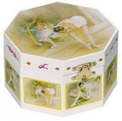Pozytywka - szkatułka wyściełana wewnątrz różową tkaniną. Po otwarciu szkatułki zaczyna grać melodia, a baletnica obraca się i przegląda w lustrze.