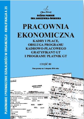 Ćwiczenia zzakresu kadr ipłac iobsługi programu kadrowo - płacowego Gratyfikant GT iPłatnik, są przeznaczone dla uczestników ośrodków kursowych, uczniów isłuchaczy szkół ekonomicznych oróżnych profilach.W opracowaniu przedstawiono zagadnienia związane z wynagrodzeniami zestosunku pracy iz umów cywilno-prawnych, zasady obliczania wynagrodzenia zaczas niewykonywania pracy, sporządzania dokumentacji związanej zprzebiegiem pracy pracowników, obliczenia wynagrodzeń, niezbędnych podatków iobciążeń wobec Zakładu Ubezpieczeń Społecznych.Przedstawiono deklaracje ztytułu ubezpieczeń społecznych, zdrowotnych oraz dotyczące podatku dochodowego. Publikacja zawiera ćwiczenia rozwiązane techniką komputerową zwykorzystaniem programów Gratyfikant GT iPłatnik oraz ćwiczenia dosamodzielnego rozwiązania. Ponadto ćwiczenia zawierają test samodzielnej kontroli podsumowujący omówiony materiał.Ćwiczenia zkadr ipłac iobsługi programu kadrowo-płacowego Gratyfikant GT iPłatnik są zbiorem ćwiczeń - zgodnie ztreścią Rozporządzenia Ministra Edukacji Narodowej iSportu zdnia 5 lutego 2004 r. wsprawie dopuszczenia doużytku szkolnego programów wychowania przedszkolnego, programów nauczania ipodręczników oraz cofania dopuszczenia - nie podlegają procedurze zatwierdzenia przez Ministra Edukacji Narodowej iSportu (Dz. U. z2004 r., nr 25, poz. 220).