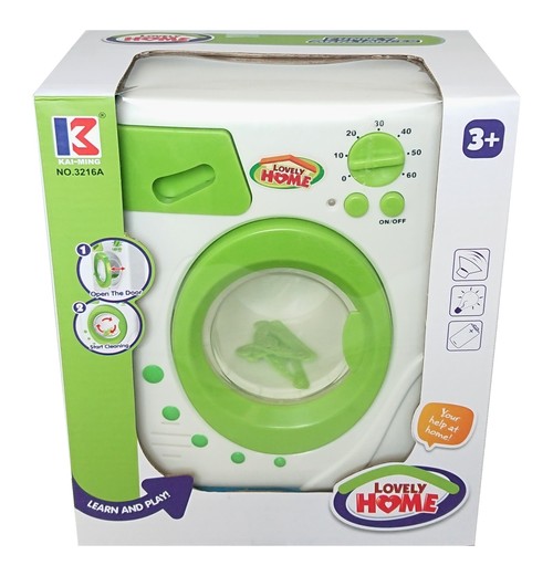 Plastikowa mini pralka ze światłem, dźwiękiem i obrotowym bębnem.