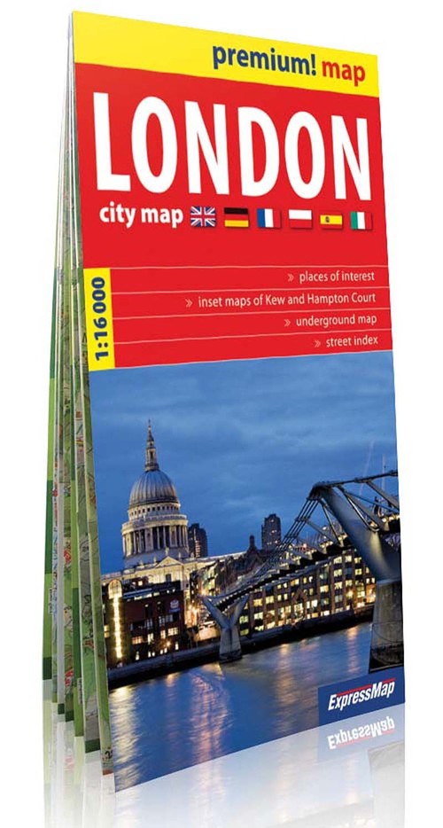 Mapa papierowa w trwałej i wygodnej kartonowej oprawie. Plan interesujących dla turysty, centralnych dzielnic miasta, szczegółowa skala 1:16 000 (1 cm - 160 m), bogata treść turystyczna, m.in.: zabytki, muzea, hotele i inne istotne obiekty, linie i stacje metra i kolejki miejskiej (Underground, Overground, DLR), plany Kew i Hampton Court, schemat metra i kolejki miejskiej (Underground, Overground, DLR) ze strefami biletowymi, skorowidz ulic.