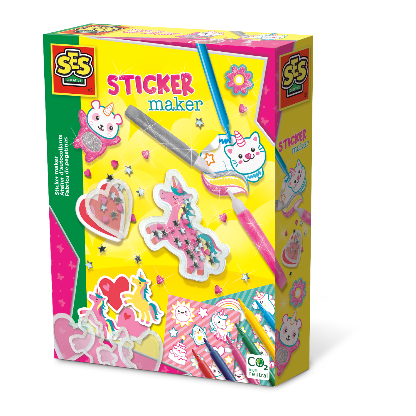 Stwórz własne naklejki ?shaker?! Dla twojej książki lub pamiętnika będzie to piękna dekoracja. Wypełnij naklejkę cekinami, serduszkami i gwiazdkami. Oprócz naklejek można również pokolorować je markerami i dwoma kolorami kleju brokatowego. Zawartość: Plastikowe nakładki do naklejek shaker; Naklejki do shakerów; Cekiny z gwiazdkami i sercem do naklejek do shakera; 2 arkusze naklejek kolorowych naklejek; 6 kolorowych markerów; Srebrny klej brokatowy; Różowy klej brokatowy;