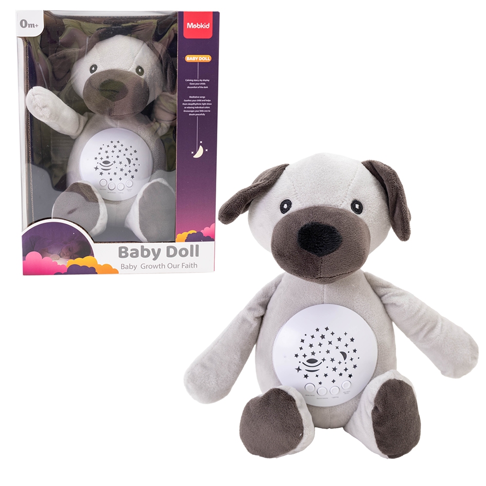 Piesek spełnia funkcje miękkiej przytulanki, przyjemnego usypiacza oraz lampki nocnej.