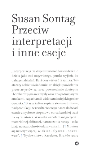 Po raz pierwszy po polsku zbiór głośnych esejów amerykańskiej intelektualistki. Opublikowany w 1966 roku, szybko stał się pozycją klasyczną i wywarł wielki wpływ na myślenie o współczesnej sztuce i kulturze. Sontag w oryginalny, a niekiedy i prowokacyjny jak na tamte czasy sposób pisze m.in. o twórczości Sartre’a, Ionesco i Lévi-Strausse’a, analizuje filmy Godarda i Bressona, podejmuje temat wyobrażenia katastrofy w filmach science fiction czy też zagadnienia współczesnej myśli religijnej. W tomie znalazły się także najbardziej znane teksty Sontag – esej tytułowy oraz Zapiski o kampie, dowodzące jej niezwykłej wrażliwości na nowe zjawiska w kulturze. Jak zaznacza we wstępie sama autorka, wartością tych tekstów jest nie tyle krytyka poszczególnych dzieł, co istotność poruszanych problemów.