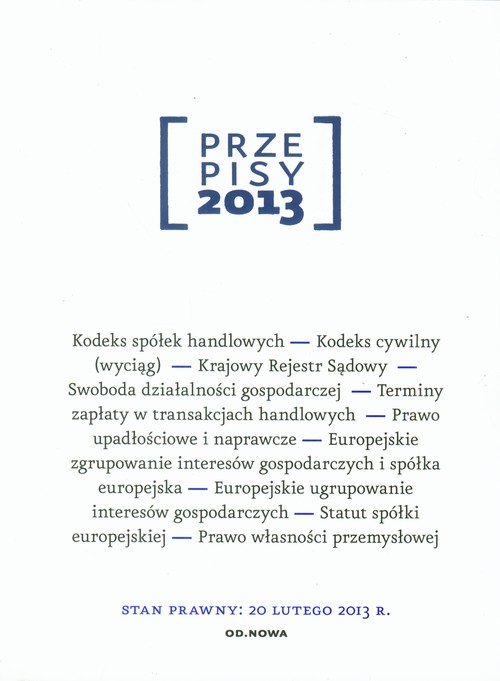 Niniejsza publikacja zawiera Kodeks spółek handlowych, Kodeks cywilny (wyciąg), ustawę o Krajowym Rejestrze Sądowym, ustawę o swobodzie działalności gospodarczej, ustawę o terminach zapłaty w transakcjach handlowych, Prawo upadłościowe i naprawcze, ustawę o wydawaniu Monitora Sądowego i Gospodarczego, ustawę o europejskim zgrupowaniu interesów gospodarczych i spółce europejskiej, rozporządzenia unijne w sprawie EUIG oraz w sprawie statutu SE, a także Prawo własności przemysłowej.