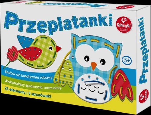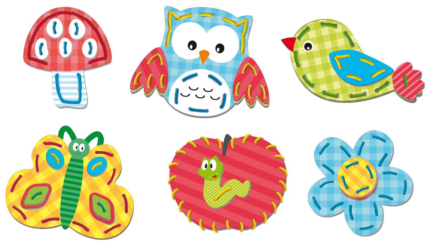 Zestaw do kreatywnej zabawy doskonalący sprawność manualną najmłodszych. Dzieci mogą swobodnie łączyć ze sobą poszczególne elementy zestawu bądź ubarwiać pojedyńcze przez przewlekanie i przeplatanie kolorowych sznurowadeł.