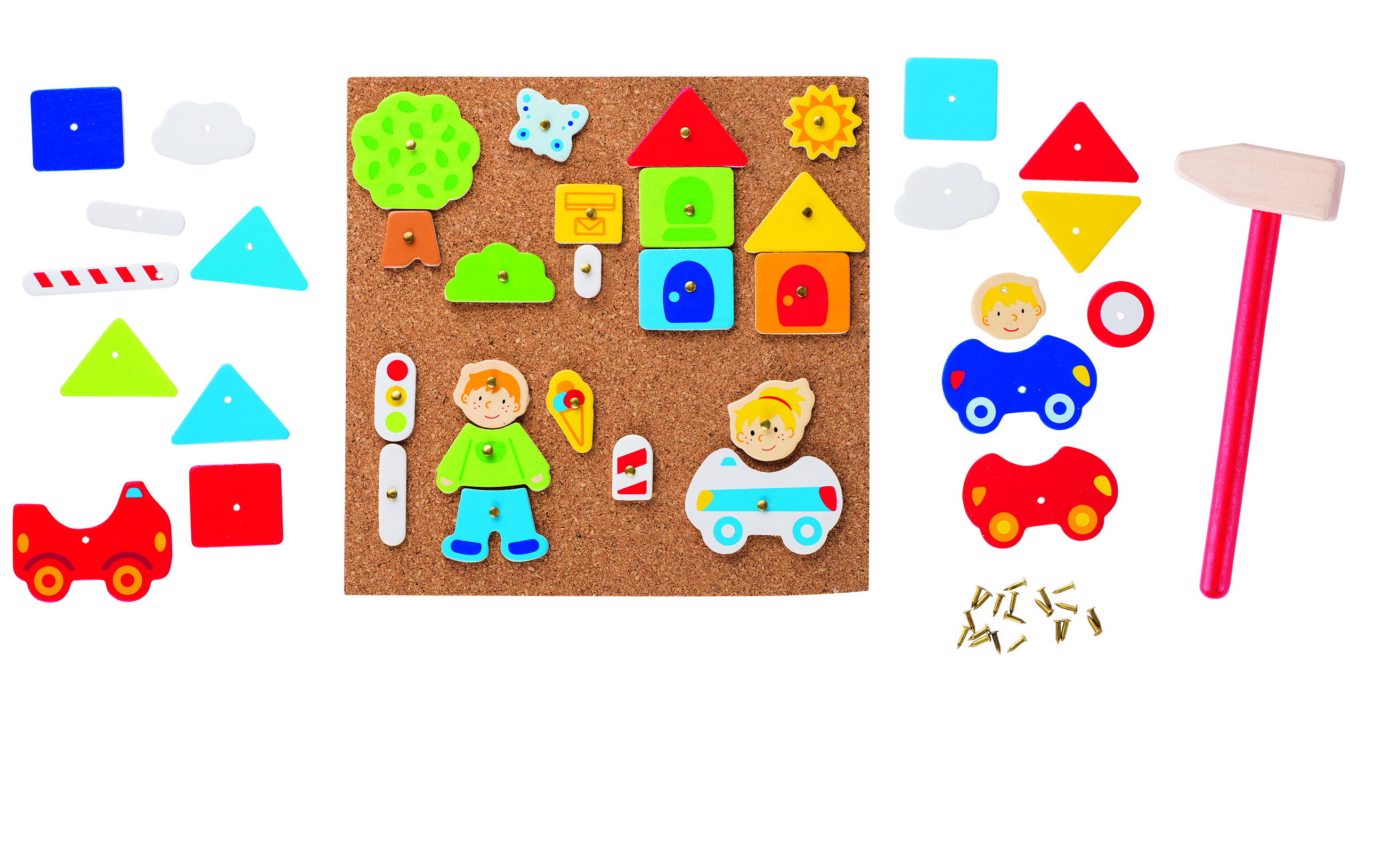 Opakowanie zawiera: planszę korkową, różnokolorowe drewniane elementy z dziurkami, metalowe pinezki do przybijania, drewniany młotek oraz kartę z wzorami. Wiek: 3+