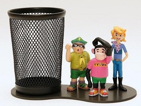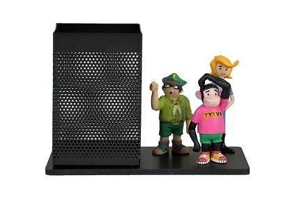 Przybornik biurkowy z trzema figurkami.