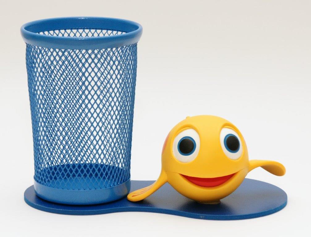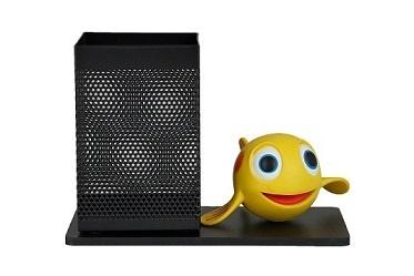 Przybornik biurkowy z jedną figurką.