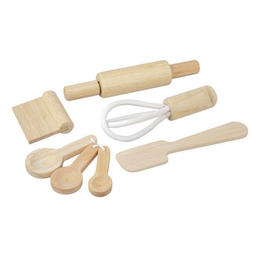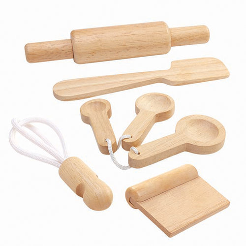 Niezbędny zestaw każdej małej kucharki i kucharza: wałek, 3 łyżki różnej wielkości, trzepaczka, wykrawaczka do ciasta i łopatka.