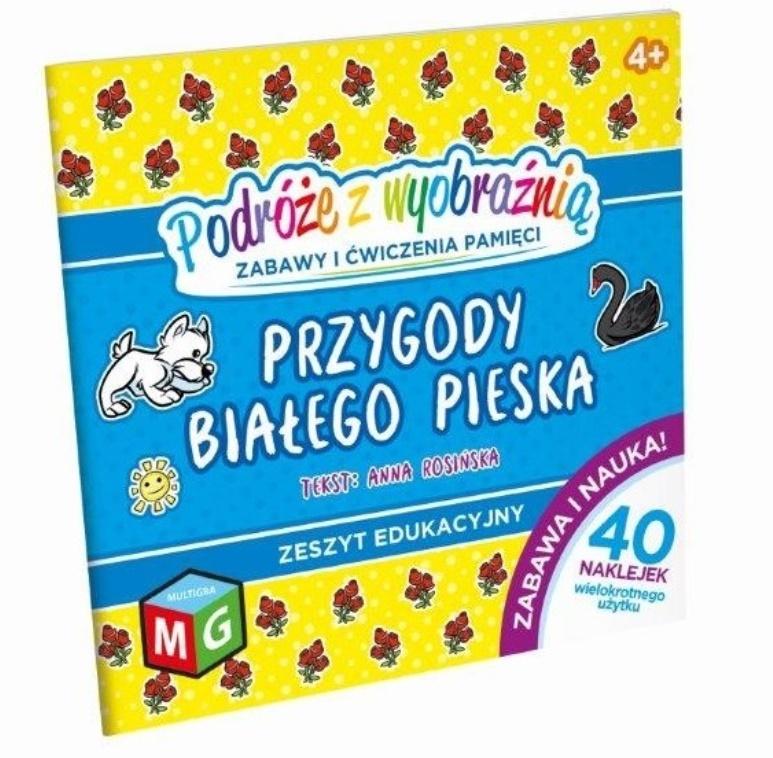 Podróże z wyobrażnią-zabawy i ćwiczenia pamięci- przygody białego pieska. Zawiera 40 naklejek wielokrotnego użytku.