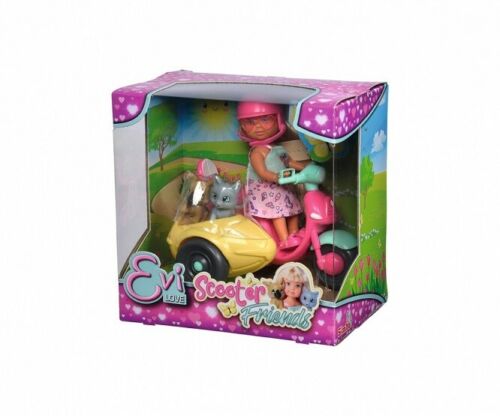 Evi zabrała kotka i pieska na przejażdżkę skuterem, zwierzęta siedzą w koszu. Evi ma kask i okulary przeciwsłoneczne. Wysokość lalki: 12 cm.