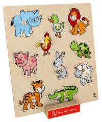 Dziesięć puzzli z uchwytami w kształcie zwierzątek.