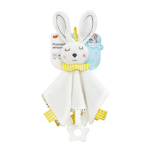 Królik wykonany z pluszowego materiału. Jest mięciutki i przyjemny w dotyku. Ma uszko służące do zwieszenia zabawki. Pełni funkcję przytulanki, zabawki do gryzienia i pierwszych ćwiczeń chwytania. W główce maskotki znajduje się delikatna grzechotka. Doskonale stymuluje małą motorykę dziecka.