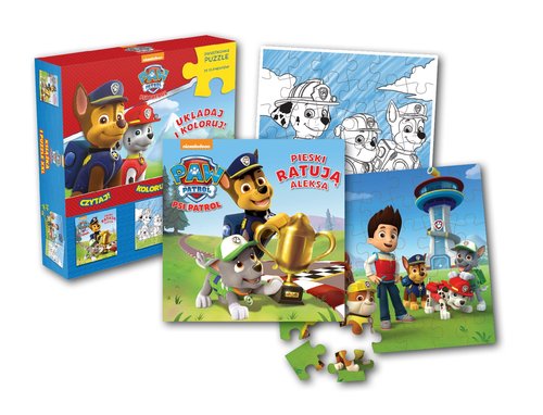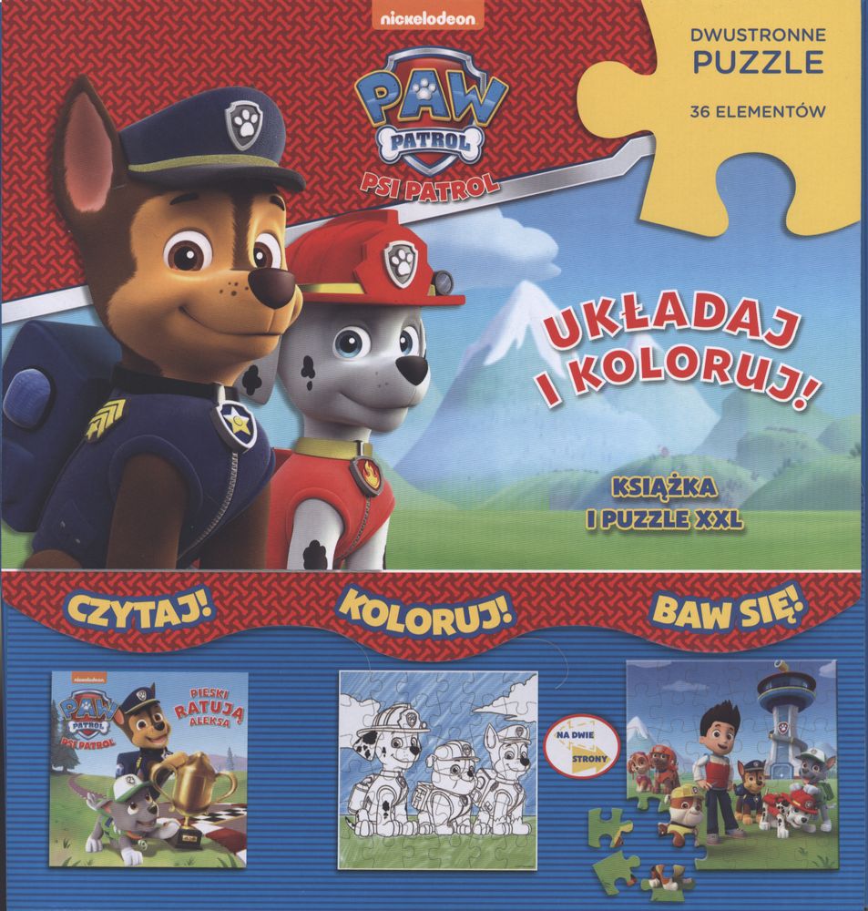 Książka i puzzle XXL ! W opakowaniu znajdziesz książkę i 36 dwustronnych puzzli z bohaterami Psiego Patrolu. Ułóż je, a następnie odwróć i pokoloruj ulubionymi kredkami.