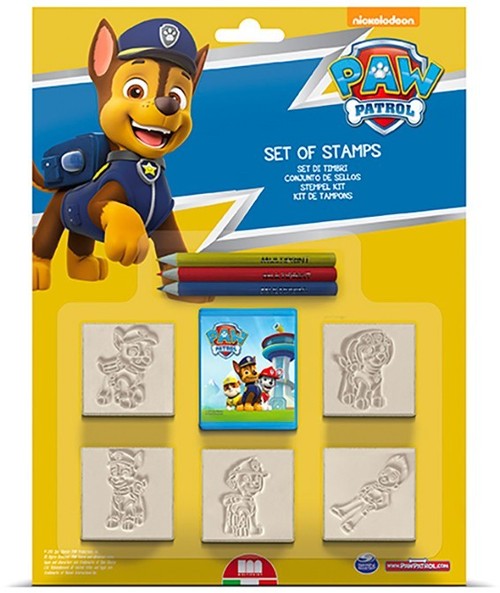 Pieczątki na licencji Psi Patrol. W skład zestawu wchodzi: 5 pieczątek, 1 poduszeczka do tuszu oraz 3 kredki.