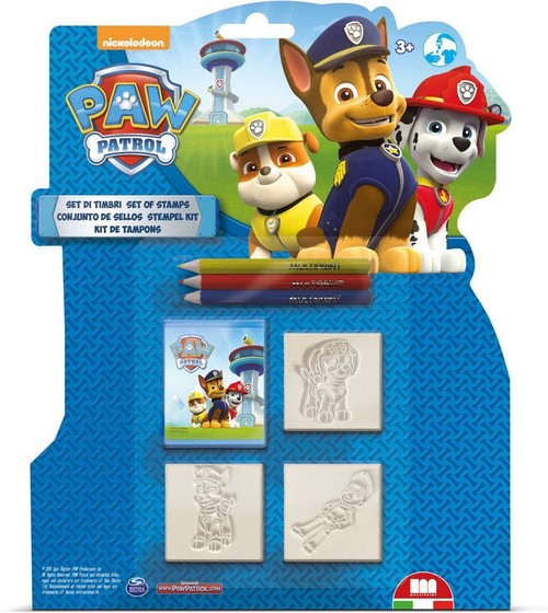 Pieczątki Psi Patrol. W skład zestawu wchodzą: 3 drewniano-gumowe pieczątki, 1 poduszeczka do tuszu i 3 kolorowe kredki ołówkowe.