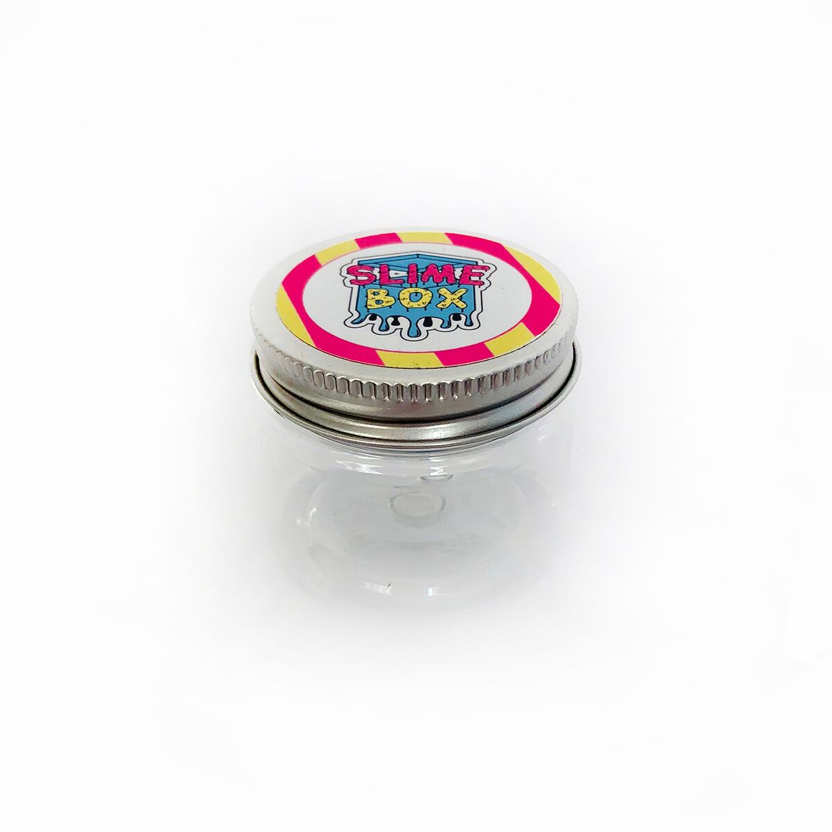 Plastikowe pudełko PET 50 ml z aluminiową nakrętką i naklejką SLIMEBOX. Idealne na Twoje mini slime'y!