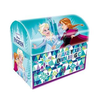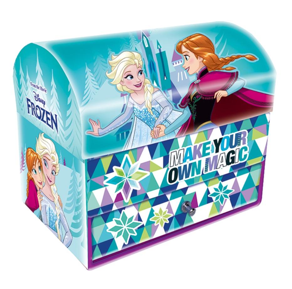 Pudełko na biżuterię o wymiarze: dł. 13 cm szer. 9cm, wys. maksymalna 12cm. Jedna szufladka o wymiarze: dł. 13,5cm, szer. 9,3cm, wys. 3 cm z metalowym grzybkiem do otwierania. Dodatkowo pudełko posiada otwierane, zaokrąglone wieczko, ścianka wieczka wyłożona jest różowym materiałem z lusterkiem w kształcie serduszka. Wewnątrz znajduje się dodatkowa przegroda o wymiarze 4 x 8,5 cm, wyłożona czerwonym pluszem, idealna do przechowywania pierścionków. Pudełko wykonane zostało z kartonu pokrytego grafiką z bajki Frozen z nadrukiem ulubionych bohaterek na wieczku. Wewnątrz pudełka karton wykończony został różowym kolorem.