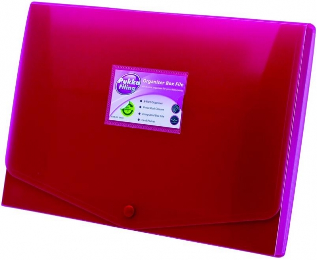 Pudełko z przekładkami zapewniające wygodę przenoszenia posegregowanych dokumentów. Zapinane na zatrzask, miejsce na wsunięcie wizytówki.