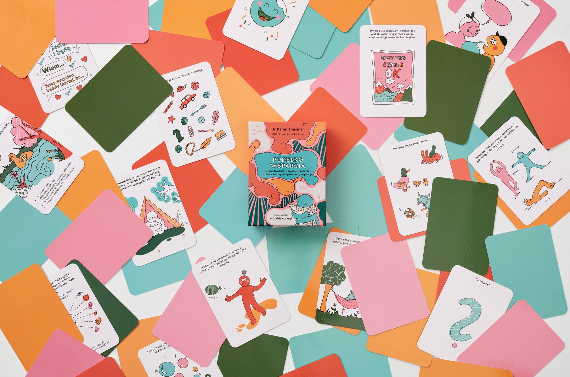 Pudełko Wsparcia zawiera 70 kart oraz broszurę wyjaśniającą, oferując radosny i bezpieczny sposób eksploracji uczuć oraz tworzenia skutecznych strategii radzenia sobie, bez naruszania granic osobistych.