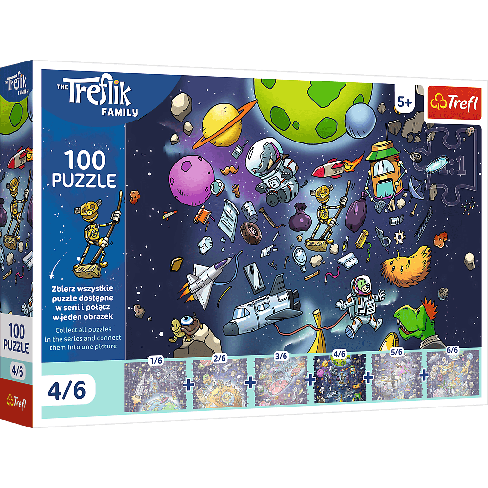 Robobotw w kosmosie (4/6), to puzzle 100 elementów i część niezwykłej kolekcji, która po złożeniu wszystkich sześciu zestawów tworzy jedną dużą, fascynującą ilustrację przedstawiającą międzyplanetarne przygody sympatycznej Rodziny Treflików.