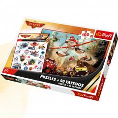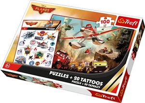 Puzzle 100 elementów oraz zestaw 20 zmywalnych tatuaży z bohaterami filmu "Samoloty 2". Po ułożeniu powstanie obrazek o wymiarach 41x27,8 cm. Wysoką jakość, nasycenie kolorów i bezpieczeństwo układania zapewnia kalandrowany papier odbijający światło i wykorzystanie materiałów ekologicznych.