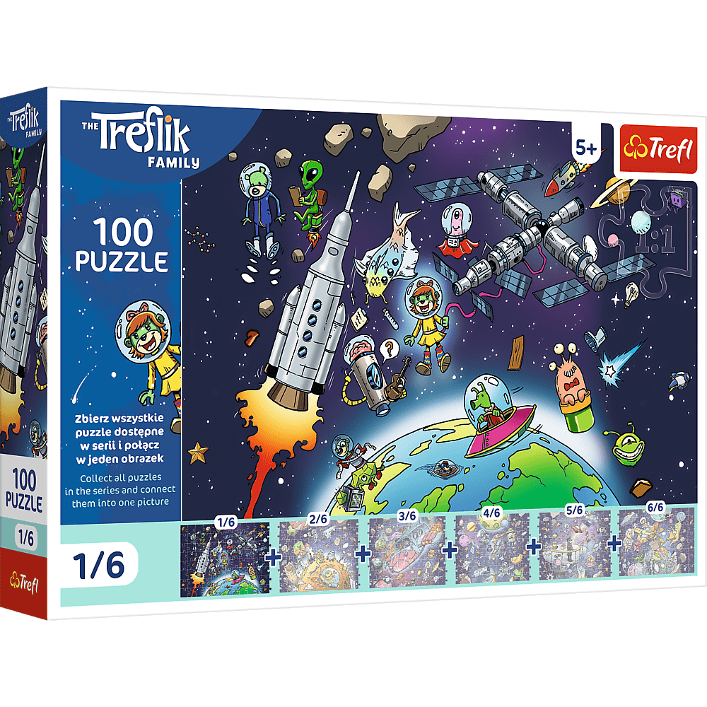 Treflinka w kosmosie (1/6), to puzzle 100 elementów i część niezwykłej kolekcji, która po złożeniu wszystkich sześciu zestawów tworzy jedną dużą, fascynującą ilustrację przedstawiającą międzyplanetarne przygody sympatycznej Rodziny Treflików.