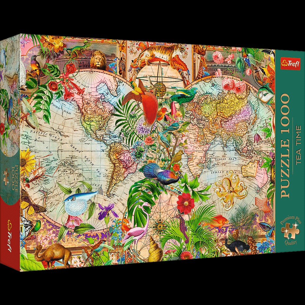 Puzzle Antyczna mapa świata przedstawiają starodawną mapę ozdobioną motywami fauny i flory. Po ich ułożeniu powstanie obraz o wymiarach 683x480 mm.